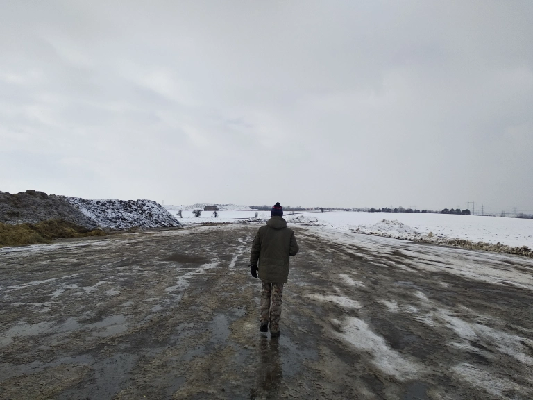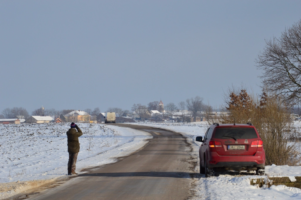 Next in the plan was a short stop near a chimney where we hoped to spot a Peregrine Falcon, but this was unfortunately not a success. However, we moved on with no heavy hearts because it is not at all a hard-to-find bird. By 1350, we got to Vyšehořovice, near a large dungpile situated in the middle of a vast expanse of fields. Such dungpiles are perfect for birds in winter due to the warmth they emanate. Strangely though, there was hardly any activity when we got there. Honza still decided to walk around the dungpile a bit, when we spotted a small bird flying low above it and giving very faint flight calls. It did land a short distance away, still on the dungpile, but we could see only the upper half of its body from our position. Nevertheless, Honza knew from the first moment that it was the Crested Lark he often sees here and that he has nicknamed Pepa (short in Czech for Josef [pronounced yo-sef]). Other than that, there were only a group of raptors soaring way in the distance, so we decided to move on to the next location. Just as we started off from the area though, we caught sight of a group of Grey Partridges in the snow. On seeing us, they flew farther into the field where some individuals were barely able to poke their heads out of the snow. We stopped for a few quick photos and set off again.
