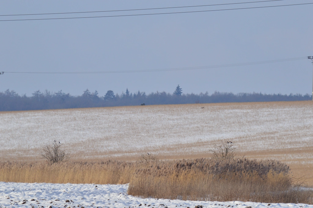Our next mission was to find a group of three Tundra Swans that had been observed in some of the fields near Dolany since the beginning of winter, but on the way we passed a large patch with long grass that stood out brilliantly against the white all around, where there seemed to be quite a few raptors. We spotted, in addition to Common Buzzards, a couple of Rough-legged Buzzards as well. The birds were quite distant but we got great views. The colours of the bird seemed to be in perfect sync with its habitat—the soft warm brown of the grass and the stunning white of the snow. This buzzard also has much sharper hands than its more common cousin does. We were enjoying the buzzard show when suddenly a female Hen Harrier decided to join the party from behind the small hill. Although I would have preferred to see the silvery male, the female was no less beautiful and elegant. Raptors were my first love and I will never stop being in awe of them. Once the birds stepped into their intermezzo, we got going once more.